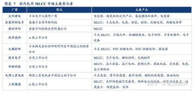 国内电容器主要厂商包括民用电容器企业国巨、深圳宇阳、风华高科、艾华集团、江海股份和法拉电子以及以军用电容器为主的火炬电子、振华科技、宏达电子及鸿远电子,其中火炬电子、鸿远电子与振华科技子公司振华云科主要生产军用MLCC,振华科技子公司振华新云与宏达电子主要生产军用钽电容。目前风华高科已开始军品业务的布局,而火炬电子、振华科技、宏达电子以及鸿远电子也在逐渐进入高端民用领域,相互渗透的趋势已经逐步形成。