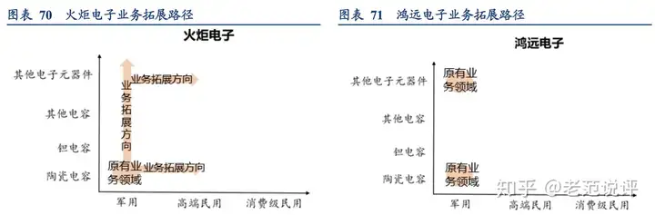 从军工行业角度,我们重点关注振华科技、宏达电子、火炬电子、鸿远电子和风华高科五家企业,它们相比国际巨头差距明显,而发展壮大的必由之路是多品类多领域的拓展。